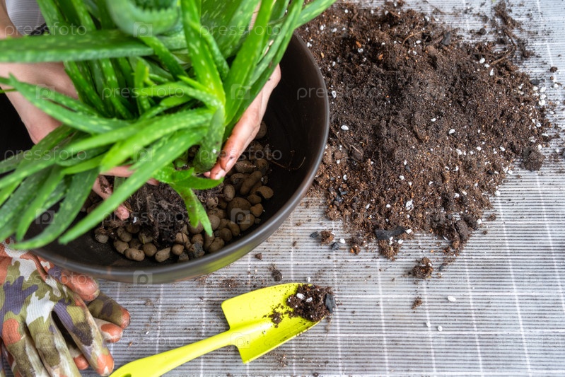 Посадка, пересадка и размножение — это отделение деток растения Алоэ Вера. Суккулент на столе, горшке, почве, совок