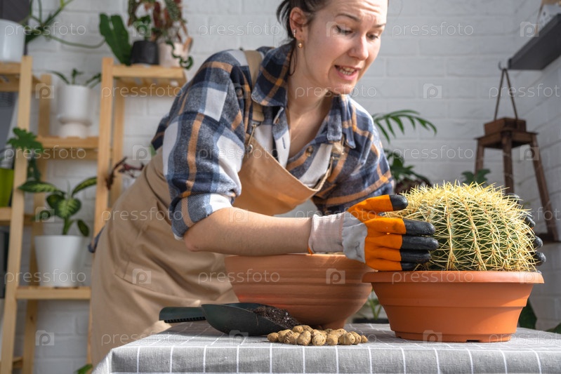 Пересадка выросшего домашнего растения большого колючего кактуса Echinocactus Gruzoni в новый горшок большего размера.Женщина с защитными перчатками осторожно держит кактус, опасаясь укола
