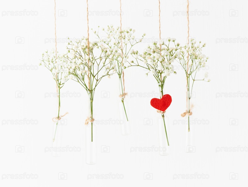 Белые цветы в стеклянных мини-вазах висят на белом фоне. Красное сердце – символ любви. Концепция Дня святого Валентина, свадебное торжество. Копировать пространство