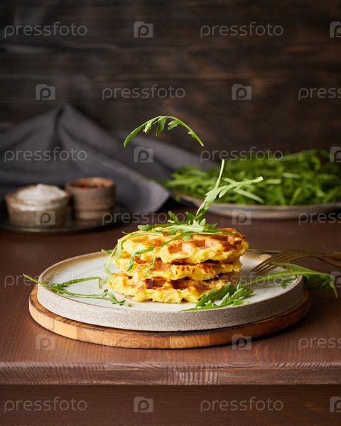 Домашние картофельные бельгийские вафли с соусом из авокадо, летающей рукколой, сыром моцарелла. Левитация. Сытный жирный завтрак. Стол темно-коричневого цвета. Крупный план, вертикальное, пространство для копирования