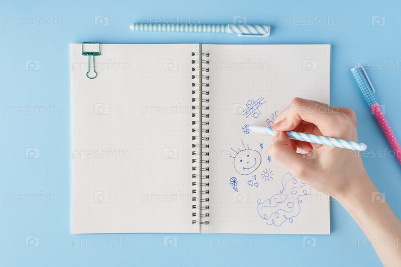 Рука рисует каракули в блокноте. Пустая страница блокнота в журнале пуль на ярко-синем офисном рабочем столе. Вид сверху на современный стол с блокнотом, канцелярскими принадлежностями. Макет, копирование пространства