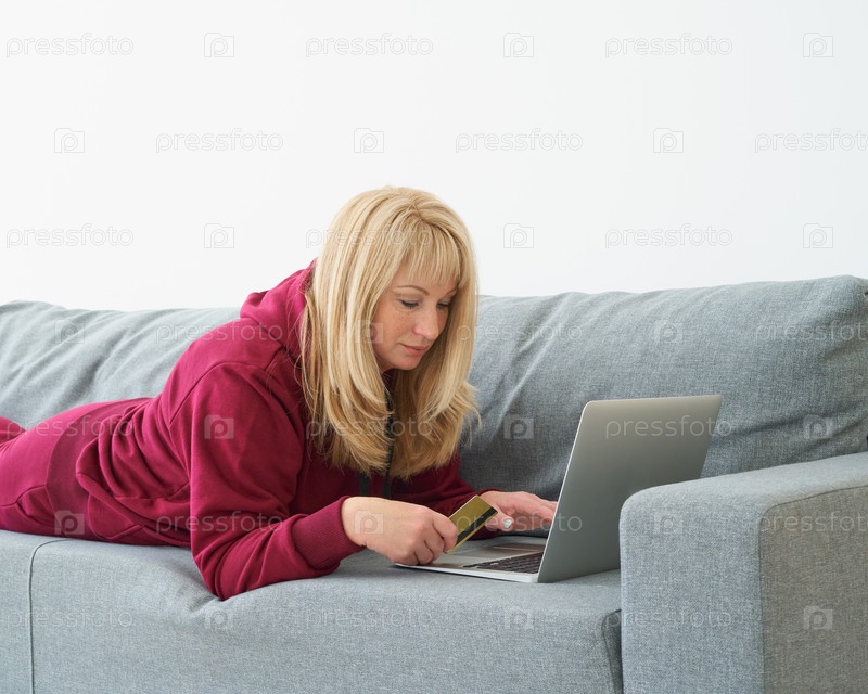 Зрелая женщина делает покупки в Интернете, лежит на диване с ноутбуком и кредитной картой. Женщина средних лет