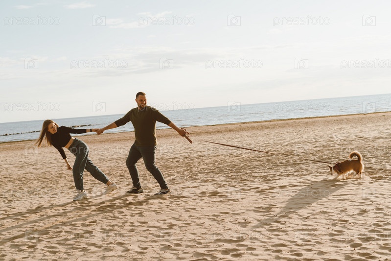 Молодая счастливая пара и собака гуляют по пляжу. Красивый мужчина держит красивую женщину и щенка корги, тянущего поводок. Прогулка по летней природе влюбленных людей. Наклонный горизонт