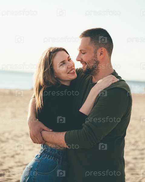 Молодая взрослая пара стоит на берегу и смотрит друг на друга. Красивый улыбающийся мужчина обнимает красивую женщину, полную любви. Тысячелетние мужчина и женщина позируют на пляже в солнечный день