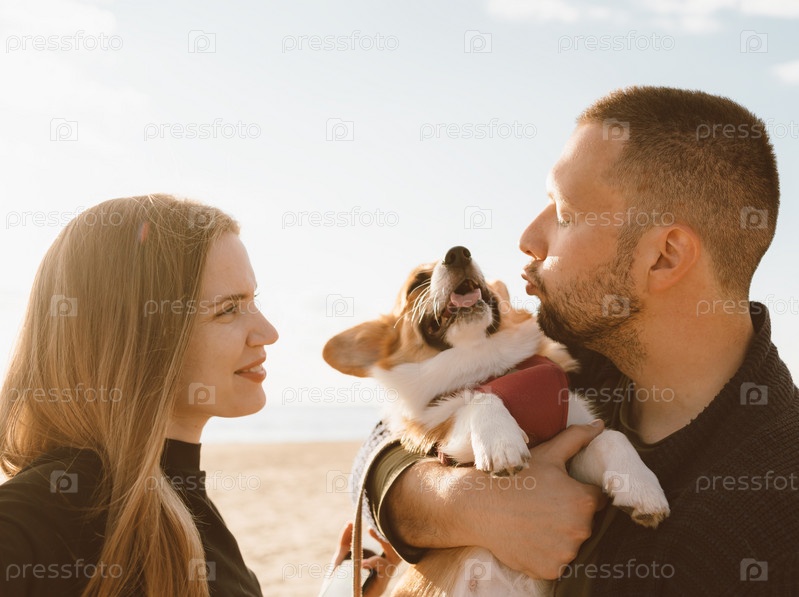 Молодая счастливая пара с собакой, гуляющей по пляжу. Красивая девушка, парень и щенок корги