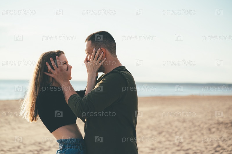 Молодая взрослая пара стоит на берегу и тыкает носы друг другу