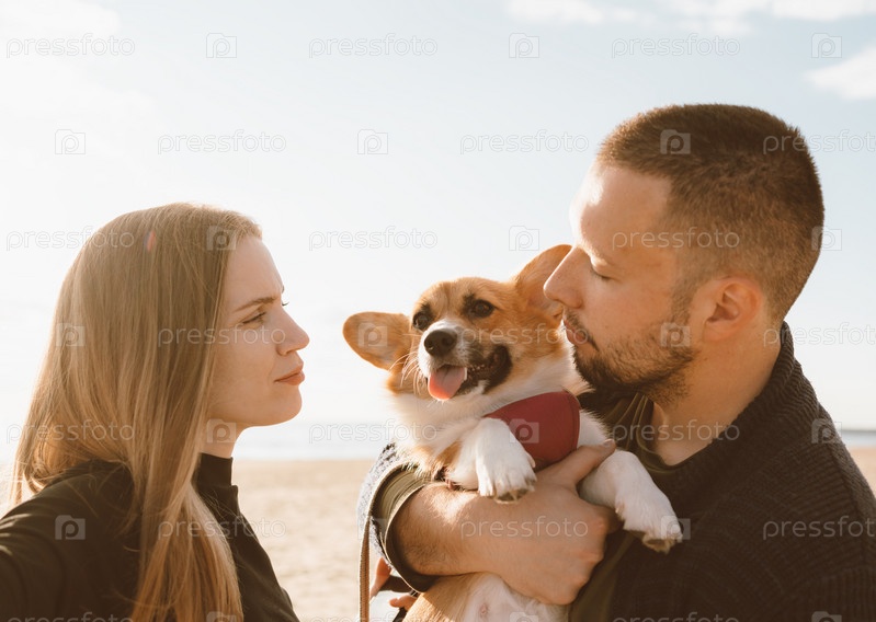 Молодая счастливая пара с собакой делает селфи на пляже. Красивая девушка, парень и щенок корги веселятся. Семейная жизнь, единение, муж и жена вместе отдыхают летом на море