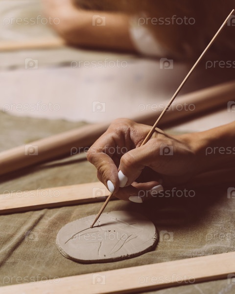 Женщина делает узор на керамической тарелке, рисует. Концепция творческого хобби. Заработайте дополнительные деньги