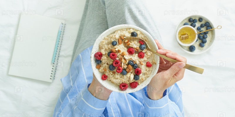 Вид сверху безликая женщина, держащая тарелку овсянки, сидящая в постели рано утром
