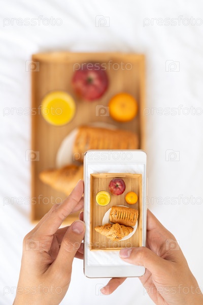 Блогер фотографирует еду, снимает завтрак в постели в отеле на мобильный телефон, поднос с соком, фруктами и круассанами на белых простынях