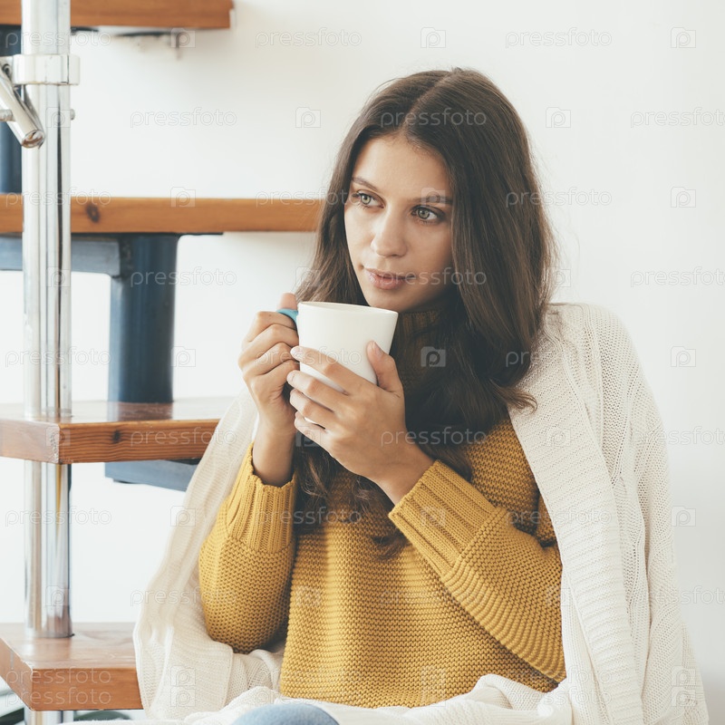 Красивая молодая женщина сидит на лестнице в теплой одежде и пьет кофе, завернувшись в одеяло, согреваясь горячим напитком. Выходные дома в уютный осенний или зимний день