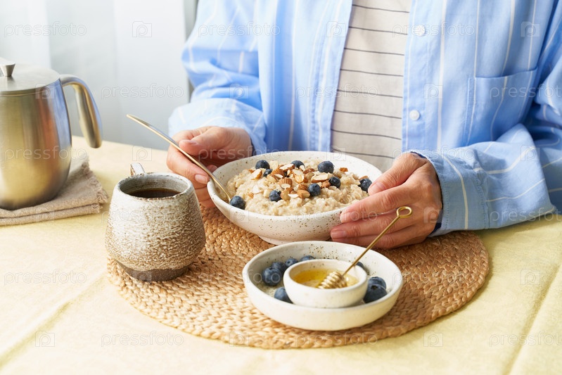Безликая женщина ест завтрак, овсяную кашу с ягодами и орехами, здоровую пищу