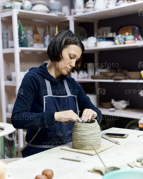Женщина делает керамическую посуду в мастерской. Концепция для женщины-фрилансера, бизнеса. Ручная работа