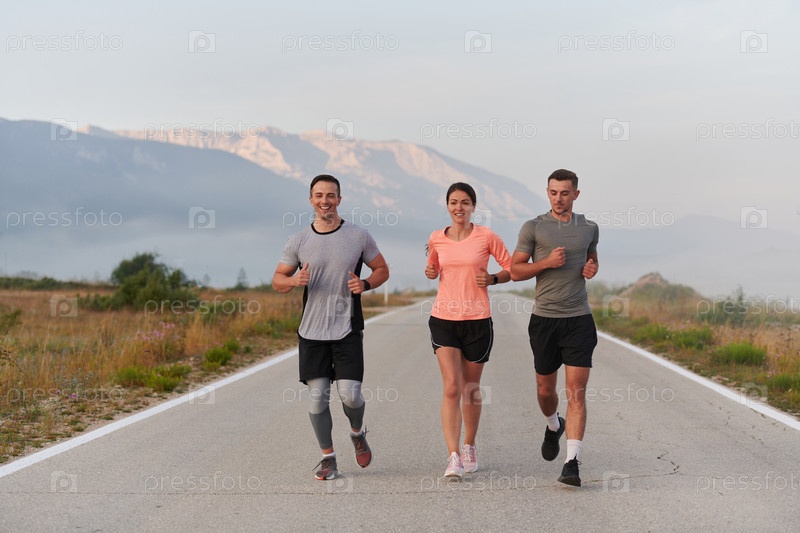 Группа друзей, спортсменов и любителей бега бегом ранним утром пробегает сквозь туманный рассвет, зарядившись энергией восходящего солнца и окруженная спокойной красотой природы