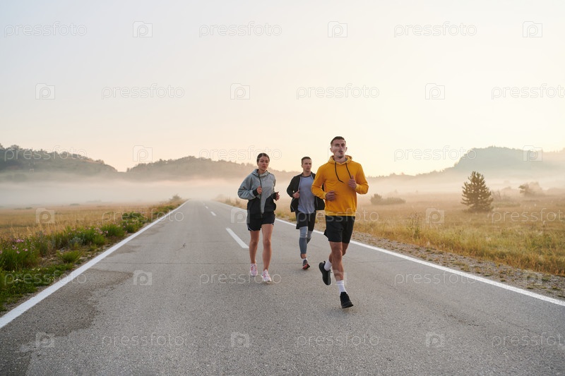 Группа друзей, спортсменов и любителей бега бегом ранним утром пробегает сквозь туманный рассвет, зарядившись энергией восходящего солнца и окруженная спокойной красотой природы