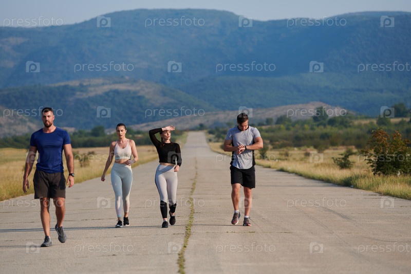 Группа друзей ведет здоровый образ жизни, бегая на свежем воздухе в солнечный день, занимаясь фитнесом и наслаждаясь бодрящим эффектом физических упражнений и природы