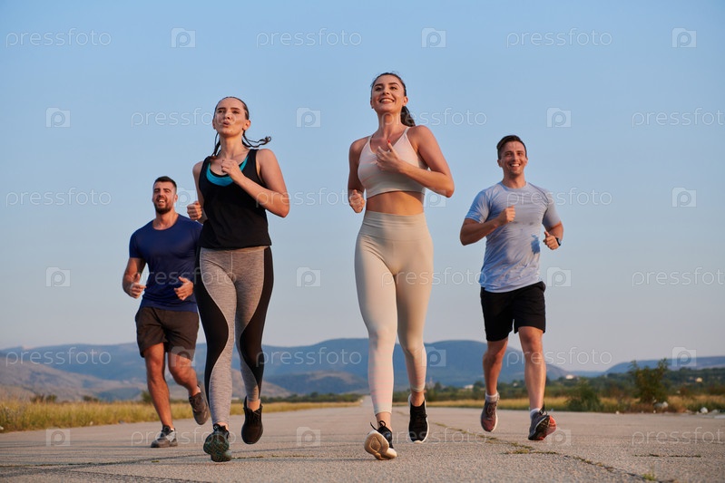 Группа друзей ведет здоровый образ жизни, бегая на свежем воздухе в солнечный день, занимаясь фитнесом и наслаждаясь бодрящим эффектом физических упражнений и природы