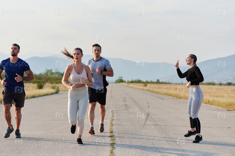 Группа друзей ведет здоровый образ жизни, бегая на свежем воздухе в солнечный день, занимаясь фитнесом и наслаждаясь бодрящим эффектом физических упражнений и природы