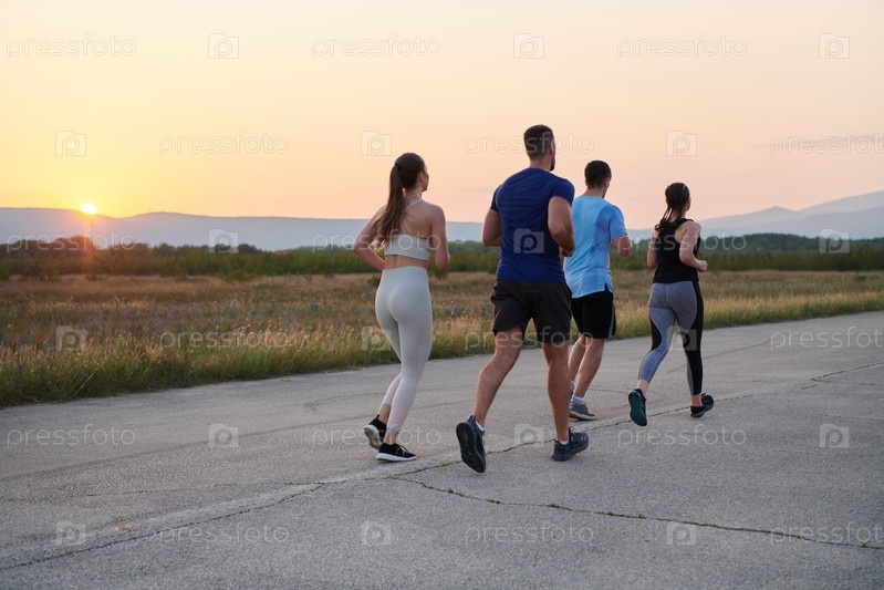 Разнообразная группа бегунов тренируется вместе на закате