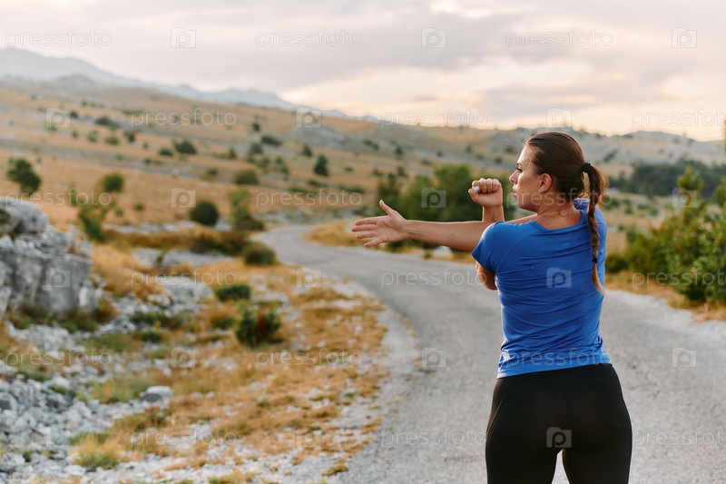 Решительная спортсменка растягивается после интенсивного бега по пересеченной горной местности