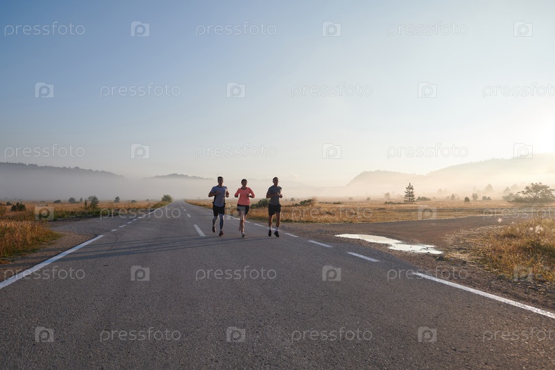Группа друзей, спортсменов и любителей бега бегом ранним утром пробегает сквозь туманный рассвет, зарядившись энергией восходящего солнца и окруженная спокойной красотой природы