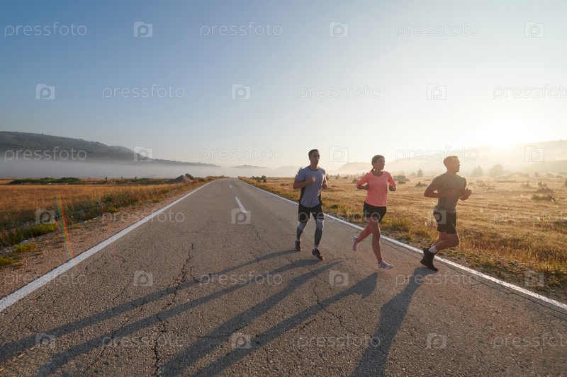 Группа друзей, спортсменов и любителей бега бегом ранним утром пробегает сквозь туманный рассвет, зарядившись энергией восходящего солнца и окруженная спокойной красотой природы