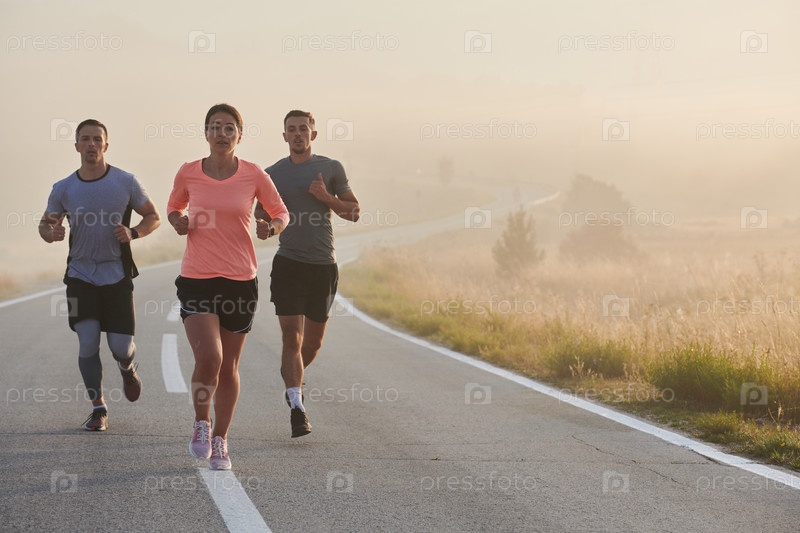 Группа друзей, спортсменов и любителей бега бегом ранним утром пробегает сквозь туманный рассвет, зарядившись энергией восходящего солнца и окруженная спокойной красотой природы