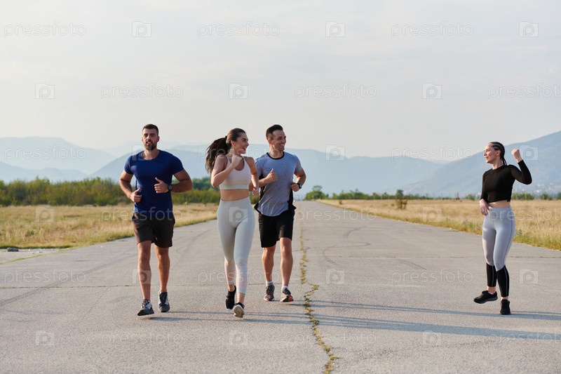 Группа друзей ведет здоровый образ жизни, бегая на свежем воздухе в солнечный день, занимаясь фитнесом и наслаждаясь бодрящим эффектом физических упражнений и природы