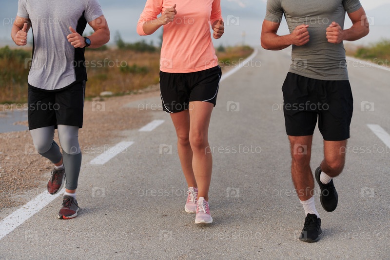 Группа друзей, спортсменов и любителей бега бегом ранним утром пробегает сквозь туманный рассвет, зарядившись энергией восходящего солнца и окруженная спокойной красотой природы