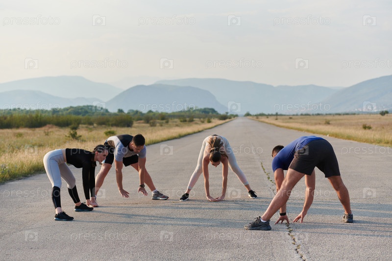 Разнообразная группа спортсменов вместе готовится к забегу