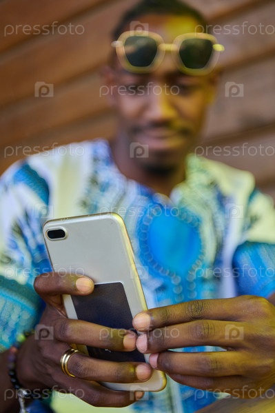 Афроамериканский подросток в традиционной суданской одежде пользуется смартфоном
