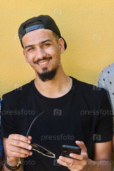 Крупный план портрета улыбающегося суданского подростка с широкой улыбкой, подбородком и кепкой, использующего смартфон