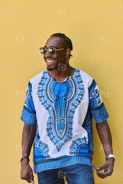 Суданские традиции встречаются с современной молодежью: афроамериканский подросток в яркой традиционной одежде на желтом фоне
