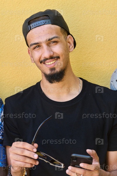 Крупный план портрета улыбающегося суданского подростка с широкой улыбкой, подбородком и кепкой, использующего смартфон