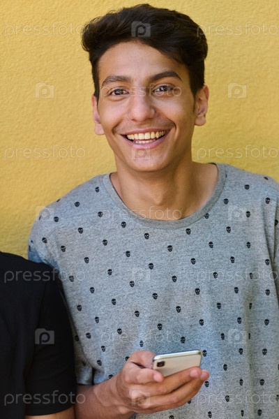 Ближневосточный подросток пользуется мобильным телефоном, прислонившись к желтой стене