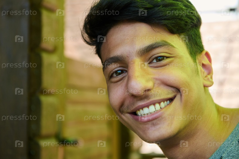 Ближневосточный мужчина с сияющей улыбкой и красивыми белыми зубами запечатлен крупным планом