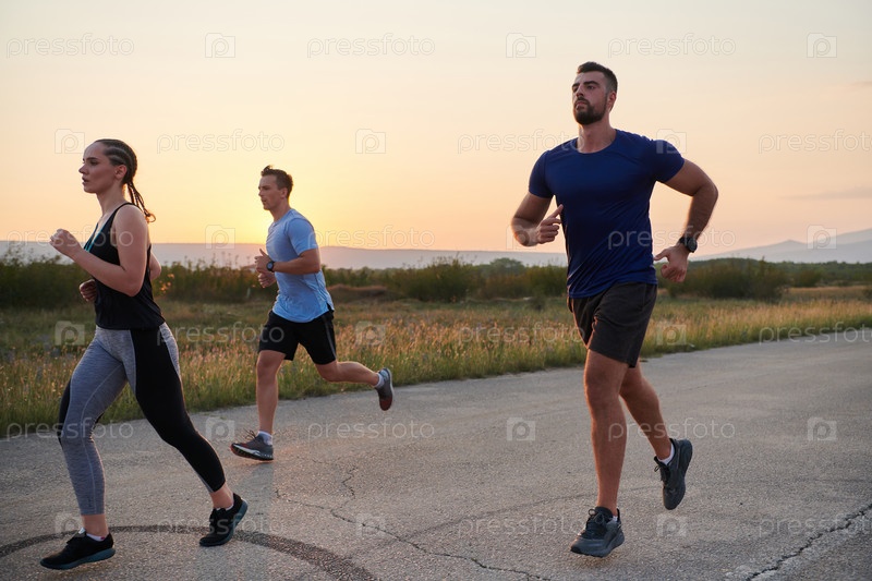 Разнообразная группа бегунов тренируется вместе на закате