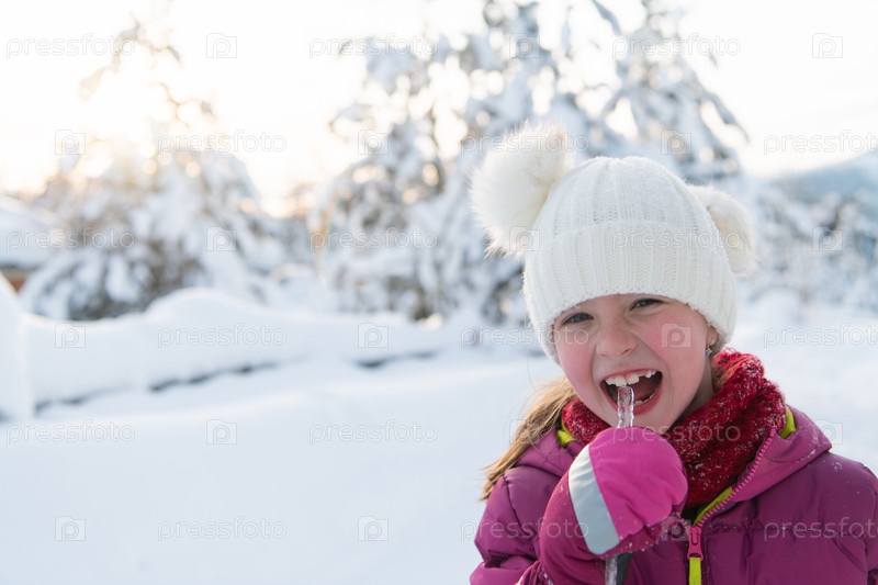 Милая маленькая девочка, поедающая сосульку в прекрасный зимний день