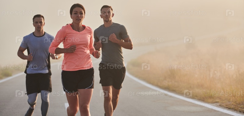 Группа друзей, спортсменов и любителей бега бегом ранним утром пробегает сквозь туманный рассвет, зарядившись энергией восходящего солнца и окруженная спокойной красотой природы