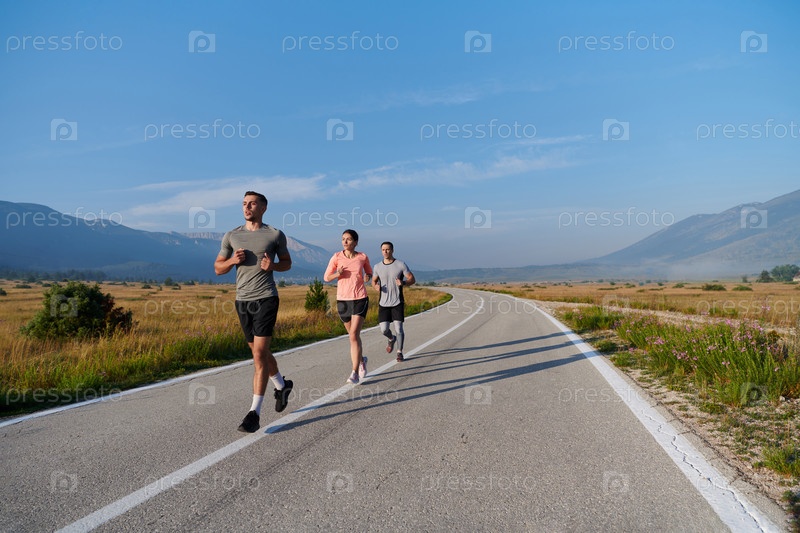 Группа друзей ведет здоровый образ жизни, бегая на свежем воздухе в солнечный день, занимаясь фитнесом и наслаждаясь бодрящим эффектом физических упражнений и природы