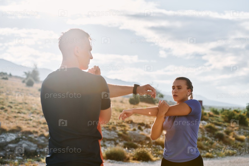 Пара растягивается после интенсивной утренней пробежки