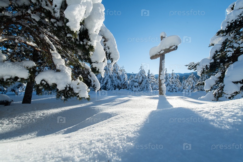 Величественный сосновый лес, залитый солнечным светом на заснеженных горах