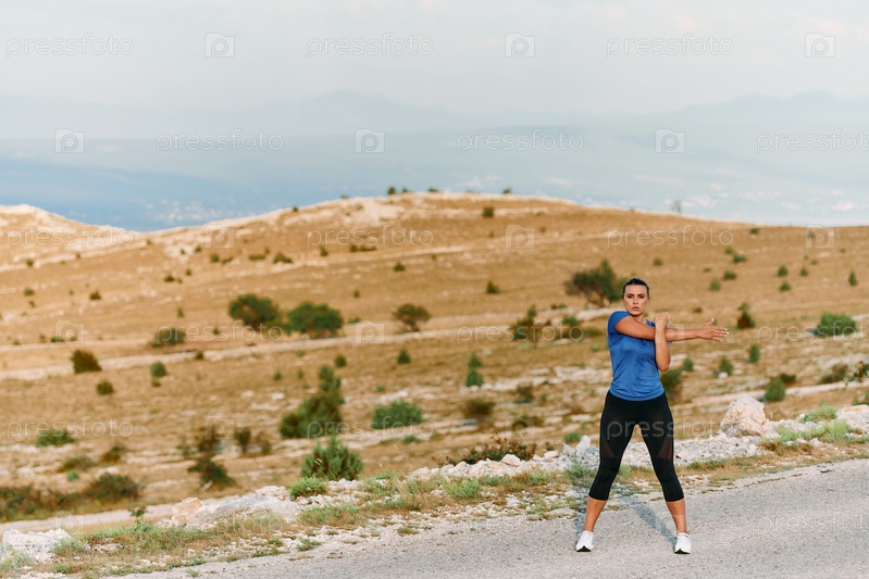 Решительная спортсменка растягивается после интенсивного бега по пересеченной горной местности