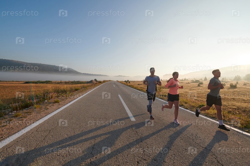 Группа друзей, спортсменов и любителей бега бегом ранним утром пробегает сквозь туманный рассвет, зарядившись энергией восходящего солнца и окруженная спокойной красотой природы