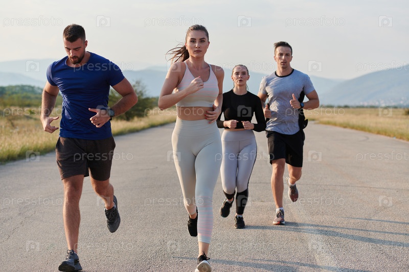 Группа друзей ведет здоровый образ жизни, бегая на свежем воздухе в солнечный день, занимаясь фитнесом и наслаждаясь бодрящим эффектом физических упражнений и природы