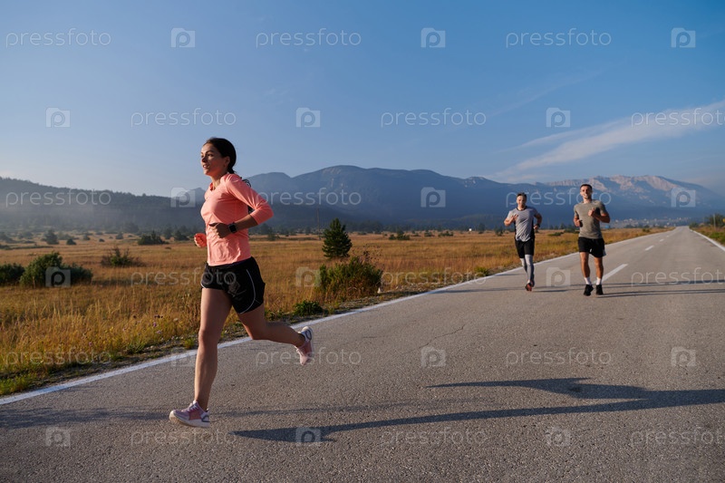 Группа друзей ведет здоровый образ жизни, бегая на свежем воздухе в солнечный день, занимаясь фитнесом и наслаждаясь бодрящим эффектом физических упражнений и природы