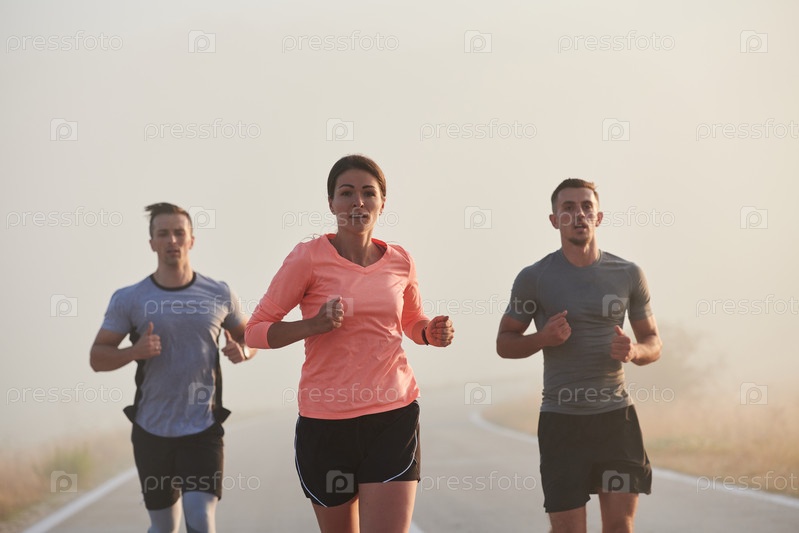 Группа друзей, спортсменов и любителей бега бегом ранним утром пробегает сквозь туманный рассвет, зарядившись энергией восходящего солнца и окруженная спокойной красотой природы