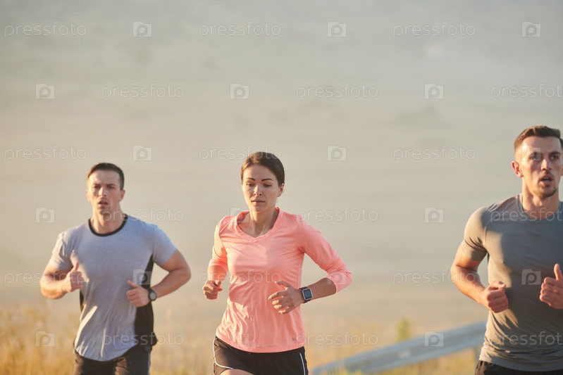 Группа друзей, спортсменов и любителей бега бегом ранним утром пробегает сквозь туманный рассвет, зарядившись энергией восходящего солнца и окруженная спокойной красотой природы
