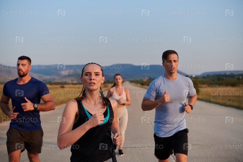 Группа друзей ведет здоровый образ жизни, бегая на свежем воздухе в солнечный день, занимаясь фитнесом и наслаждаясь бодрящим эффектом физических упражнений и природы
