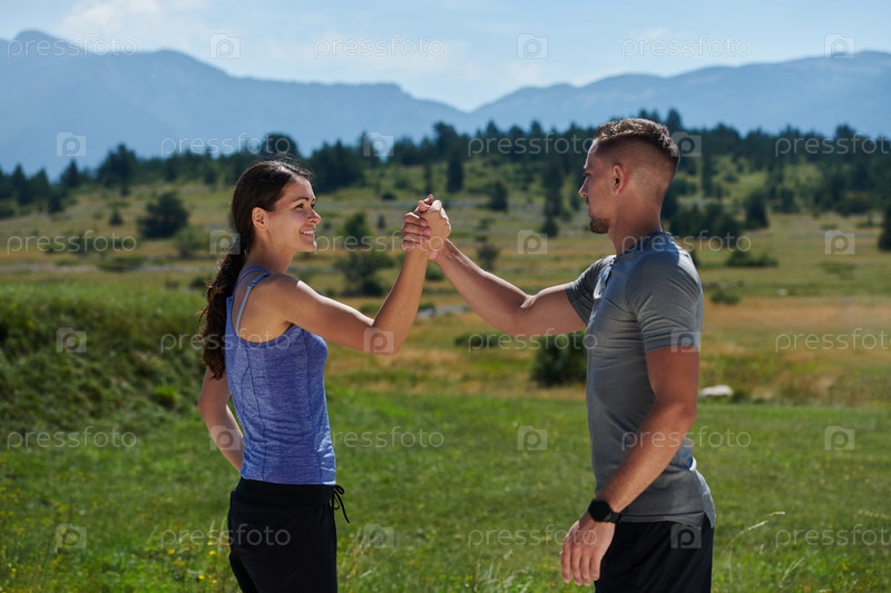 Победоносные объятия: романтические рукопожатия пары после успешного ежедневного забега